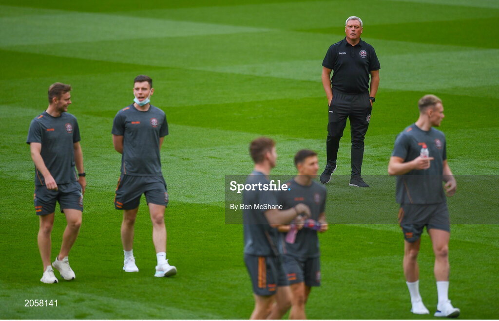 3 August 2021; Bohemians manager Keith Long inspects the pitch with his players before the UEFA Europa Conference League third qualifying round first leg match between Bohemians and PAOK at Aviva Stadium in Dublin. Photo by Ben McShane/Sportsfile