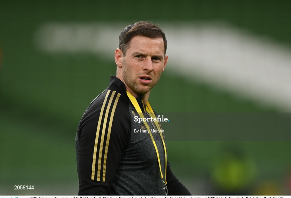 3 August 2021; Bohemians performance coach Philip McMahon before the UEFA Europa Conference League third qualifying round first leg match between Bohemians and PAOK at Aviva Stadium in Dublin. Photo by Harry Murphy/Sportsfile