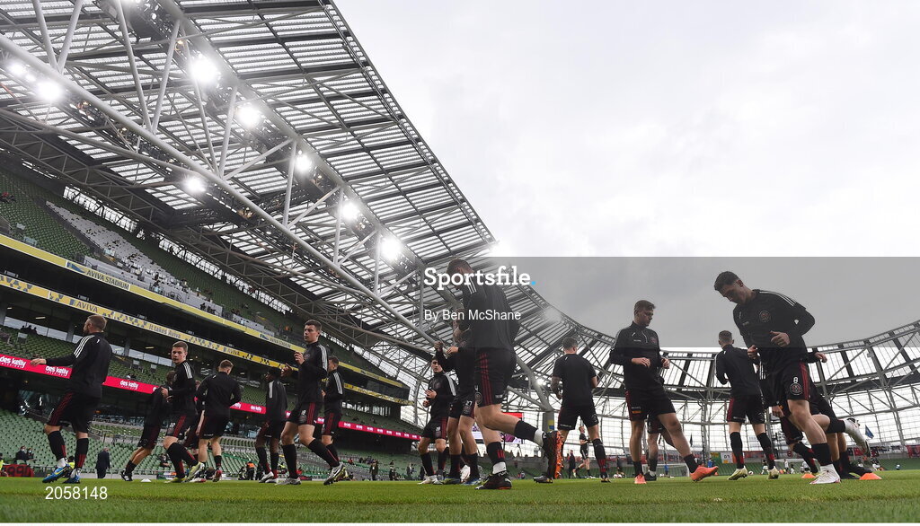3 August 2021; Bohemians players warm up before the UEFA Europa Conference League third qualifying round first leg match between Bohemians and PAOK at Aviva Stadium in Dublin. Photo by Ben McShane/Sportsfile