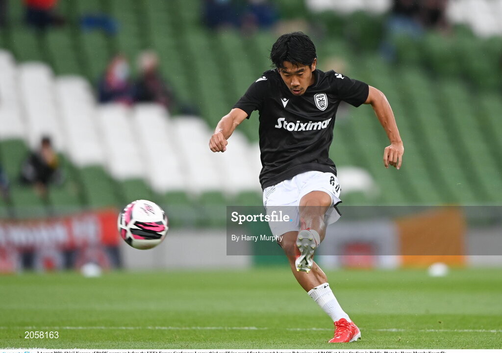 3 August 2021; Shinji Kagawa of PAOK warms up before the UEFA Europa Conference League third qualifying round first leg match between Bohemians and PAOK at Aviva Stadium in Dublin. Photo by Harry Murphy/Sportsfile