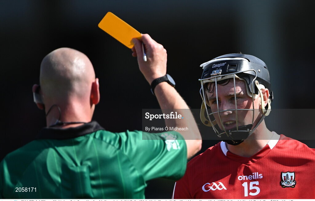 23 July 2021; Jack O'Connor of Cork is show a first yellow card by referee John Keenan during the GAA Hurling All-Ireland Senior Championship Round 2 match between Clare and Cork at LIT Gaelic Grounds in Limerick. Photo by Piaras Ó Mídheach/Sportsfile
