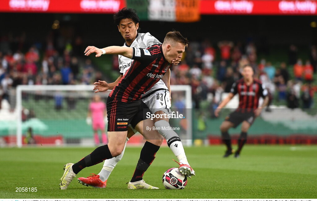 3 August 2021; Andy Lyons of Bohemians in action against Shinji Kagawa of PAOK during the UEFA Europa Conference League third qualifying round first leg match between Bohemians and PAOK at Aviva Stadium in Dublin. Photo by Ben McShane/Sportsfile