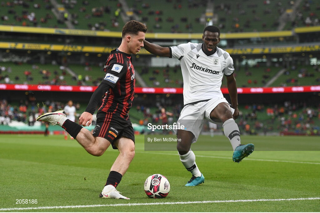 3 August 2021; Ali Coote of Bohemians in action against Anderson Esiti of PAOK during the UEFA Europa Conference League third qualifying round first leg match between Bohemians and PAOK at Aviva Stadium in Dublin. Photo by Ben McShane/Sportsfile