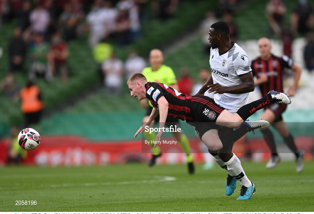 3 August 2021; Ross Tierney of Bohemians is tackled by Anderson Esiti of PAOK during the UEFA Europa Conference League third qualifying round first leg match between Bohemians and PAOK at Aviva Stadium in Dublin. Photo by Harry Murphy/Sportsfile