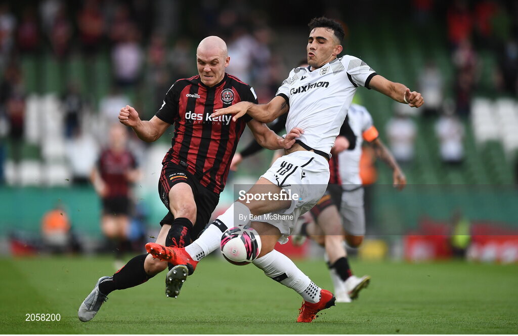 3 August 2021; Georgie Kelly of Bohemians in action against Giannis Michailidis of PAOK during the UEFA Europa Conference League third qualifying round first leg match between Bohemians and PAOK at Aviva Stadium in Dublin. Photo by Ben McShane/Sportsfile