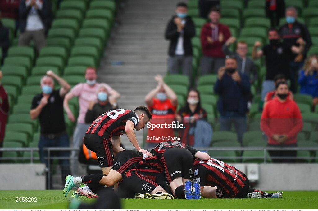 3 August 2021; Bohemians players celebrate after their first goal, scored by Ali Coote, hidden, during the UEFA Europa Conference League third qualifying round first leg match between Bohemians and PAOK at Aviva Stadium in Dublin. Photo by Ben McShane/Sportsfile