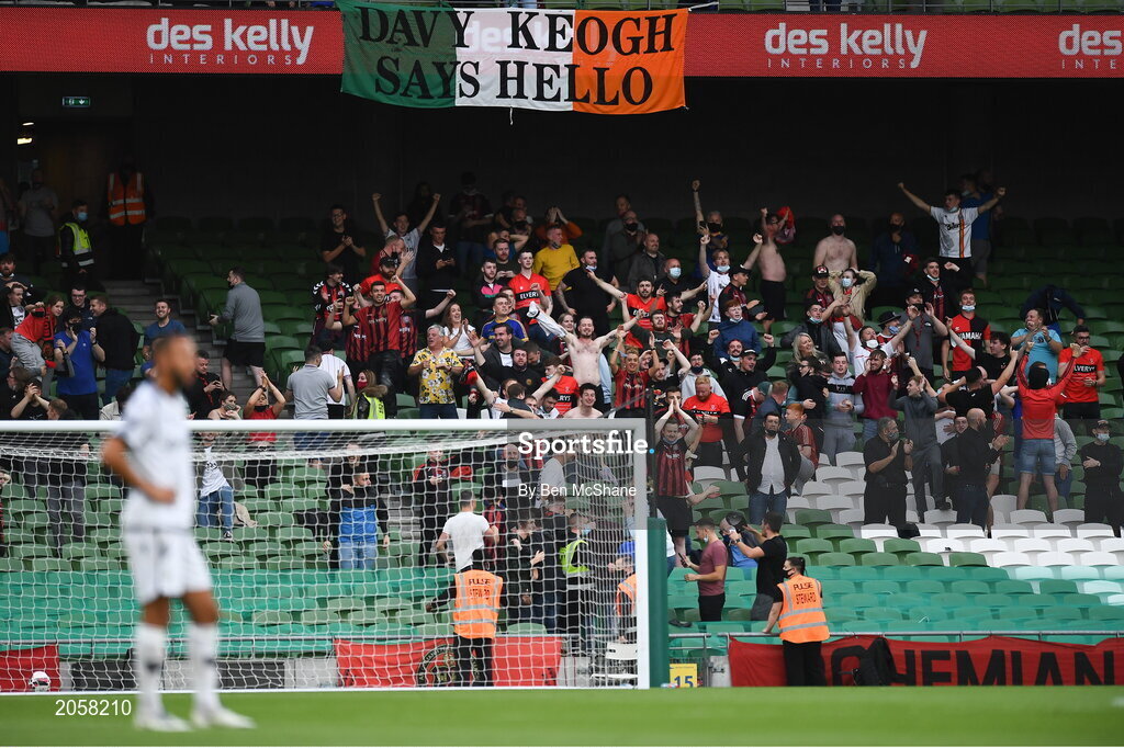 3 August 2021; Bohemians supporters celebrate after their first goal, scored by Ali Coote, hidden, during the UEFA Europa Conference League third qualifying round first leg match between Bohemians and PAOK at Aviva Stadium in Dublin. Photo by Ben McShane/Sportsfile