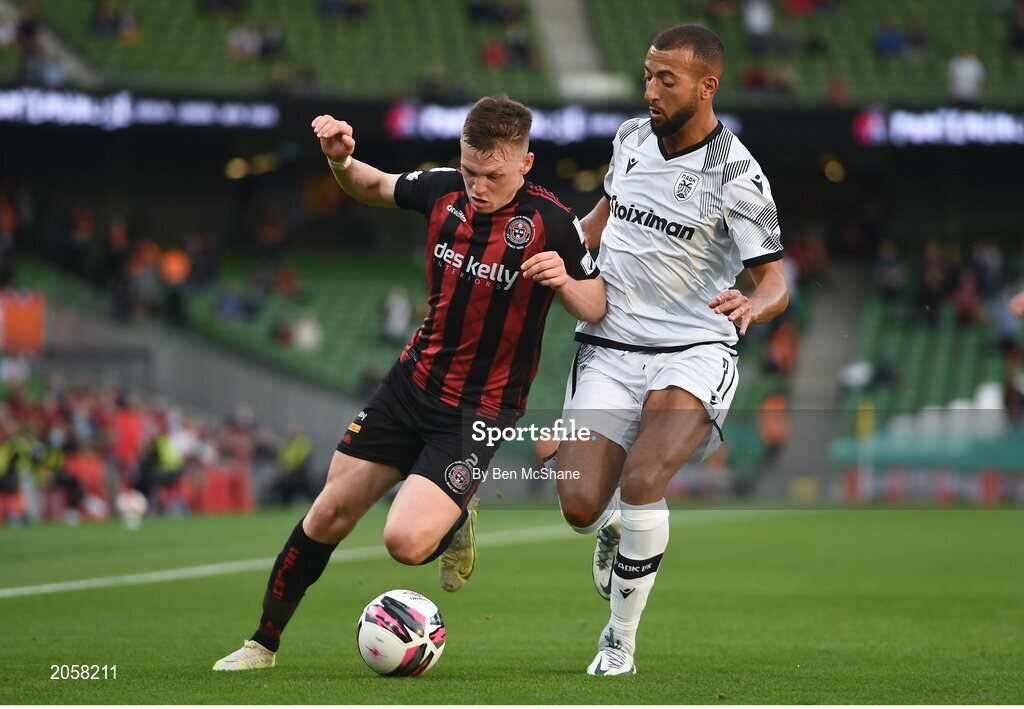 3 August 2021; Andy Lyons of Bohemians in action against Omar El Kaddouri of PAOK during the UEFA Europa Conference League third qualifying round first leg match between Bohemians and PAOK at Aviva Stadium in Dublin. Photo by Ben McShane/Sportsfile
