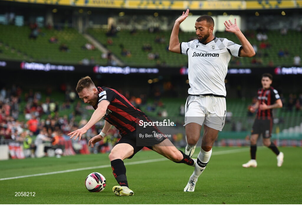 3 August 2021; Andy Lyons of Bohemians in action against Omar El Kaddouri of PAOK during the UEFA Europa Conference League third qualifying round first leg match between Bohemians and PAOK at Aviva Stadium in Dublin. Photo by Ben McShane/Sportsfile