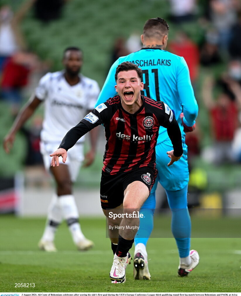 3 August 2021; Ali Coote of Bohemians celebrates after scoring his side's first goal during the UEFA Europa Conference League third qualifying round first leg match between Bohemians and PAOK at Aviva Stadium in Dublin. Photo by Harry Murphy/Sportsfile