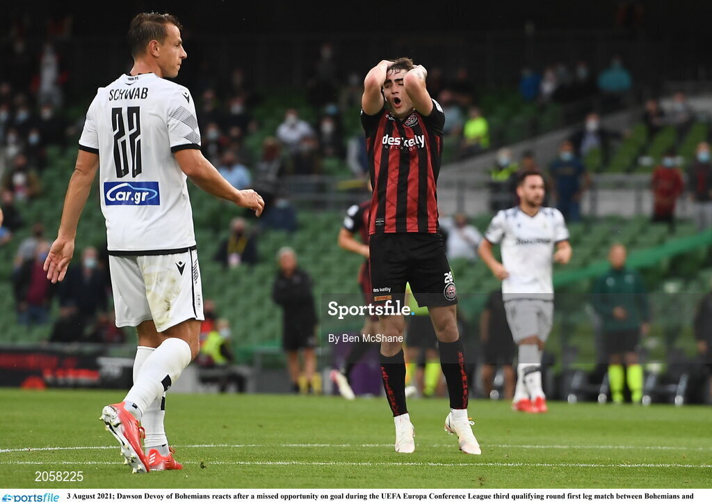 3 August 2021; Dawson Devoy of Bohemians reacts after a missed opportunity on goal during the UEFA Europa Conference League third qualifying round first leg match between Bohemians and PAOK at Aviva Stadium in Dublin. Photo by Ben McShane/Sportsfile