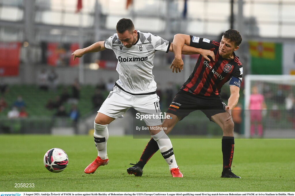 3 August 2021; Andrija Živkovic of PAOK in action against Keith Buckley of Bohemians during the UEFA Europa Conference League third qualifying round first leg match between Bohemians and PAOK at Aviva Stadium in Dublin. Photo by Ben McShane/Sportsfile
