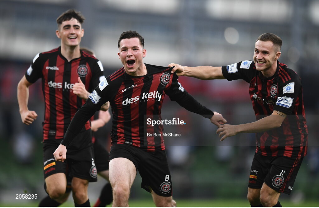 3 August 2021; Ali Coote of Bohemians celebrates after scoring his side's second goal with team-mates Liam Burt, right, and Dawson Devoy during the UEFA Europa Conference League third qualifying round first leg match between Bohemians and PAOK at Aviva Stadium in Dublin. Photo by Ben McShane/Sportsfile