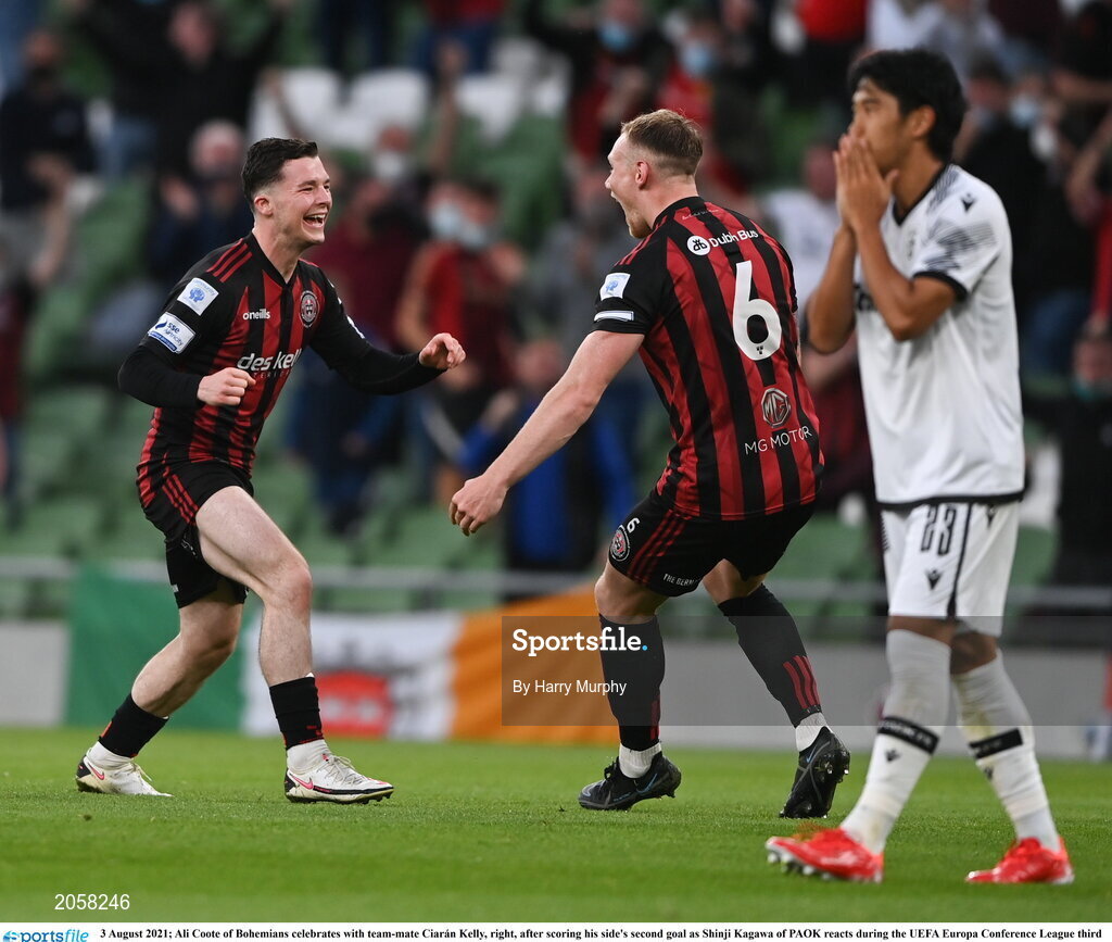 3 August 2021; Ali Coote of Bohemians celebrates with team-mate Ciarán Kelly, right, after scoring his side's second goal as Shinji Kagawa of PAOK reacts during the UEFA Europa Conference League third qualifying round first leg match between Bohemians and PAOK at Aviva Stadium in Dublin. Photo by Harry Murphy/Sportsfile