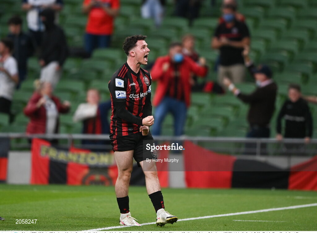 3 August 2021; Ali Coote of Bohemians celebrates after scoring his side's second goal during the UEFA Europa Conference League third qualifying round first leg match between Bohemians and PAOK at Aviva Stadium in Dublin. Photo by Harry Murphy/Sportsfile