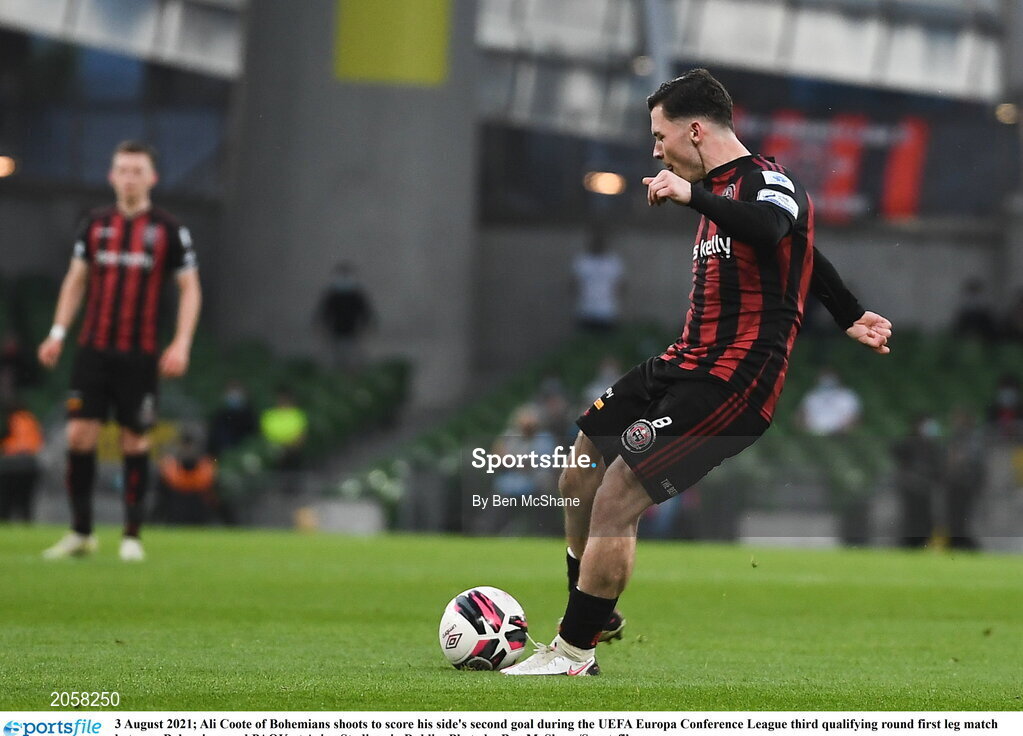3 August 2021; Ali Coote of Bohemians shoots to score his side's second goal during the UEFA Europa Conference League third qualifying round first leg match between Bohemians and PAOK at Aviva Stadium in Dublin. Photo by Ben McShane/Sportsfile
