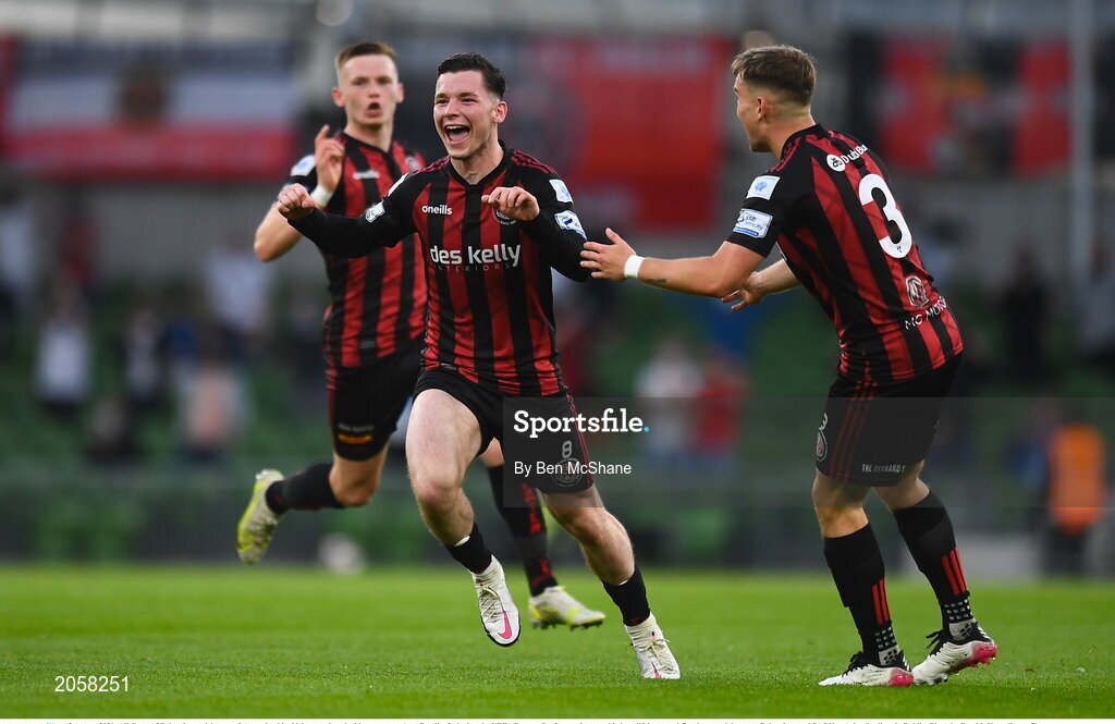 3 August 2021; Ali Coote of Bohemians celebrates after scoring his side's second goal with team-mate Anto Breslin, 3, during the UEFA Europa Conference League third qualifying round first leg match between Bohemians and PAOK at Aviva Stadium in Dublin. Photo by Ben McShane/Sportsfile