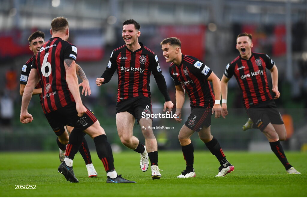3 August 2021; Ali Coote, centre, celebrates after scoring his side's second goal with his Bohemians team-mates during the UEFA Europa Conference League third qualifying round first leg match between Bohemians and PAOK at Aviva Stadium in Dublin. Photo by Ben McShane/Sportsfile
