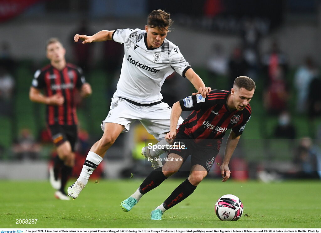 3 August 2021; Liam Burt of Bohemians in action against Thomas Murg of PAOK during the UEFA Europa Conference League third qualifying round first leg match between Bohemians and PAOK at Aviva Stadium in Dublin. Photo by Ben McShane/Sportsfile