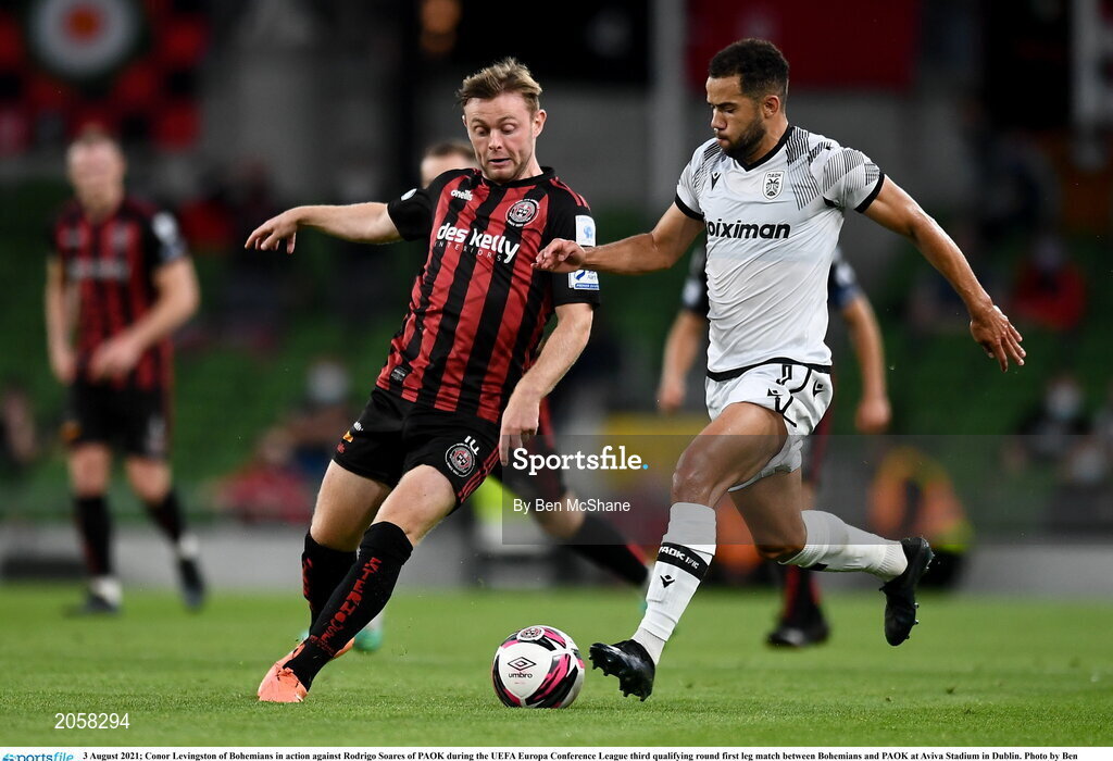 3 August 2021; Conor Levingston of Bohemians in action against Rodrigo Soares of PAOK during the UEFA Europa Conference League third qualifying round first leg match between Bohemians and PAOK at Aviva Stadium in Dublin. Photo by Ben McShane/Sportsfile