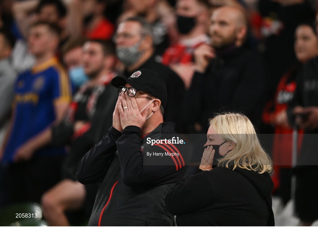 3 August 2021; Bohemians fans look on during the closing stages of the UEFA Europa Conference League third qualifying round first leg match between Bohemians and PAOK at Aviva Stadium in Dublin. Photo by Harry Murphy/Sportsfile