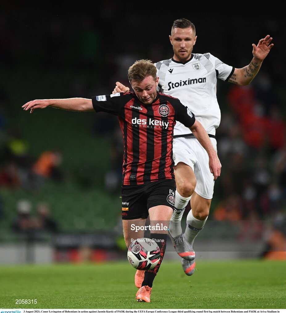 3 August 2021; Conor Levingston of Bohemians in action against Jasmin Kurtic of PAOK during the UEFA Europa Conference League third qualifying round first leg match between Bohemians and PAOK at Aviva Stadium in Dublin. Photo by Ben McShane/Sportsfile