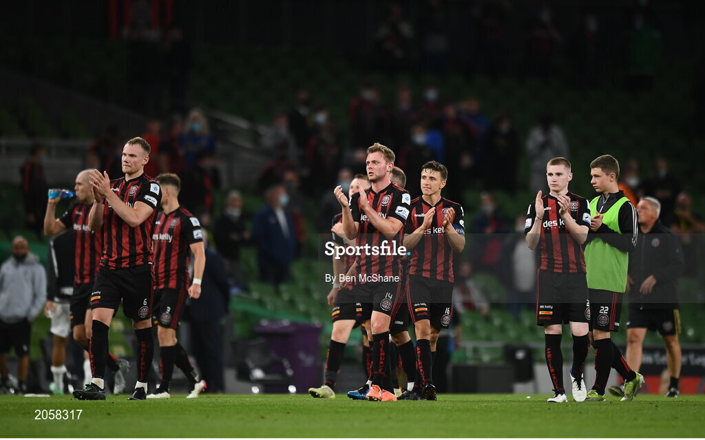 3 August 2021; Bohemians players applaud to their supporters after their victory in the UEFA Europa Conference League third qualifying round first leg match between Bohemians and PAOK at Aviva Stadium in Dublin. Photo by Ben McShane/Sportsfile