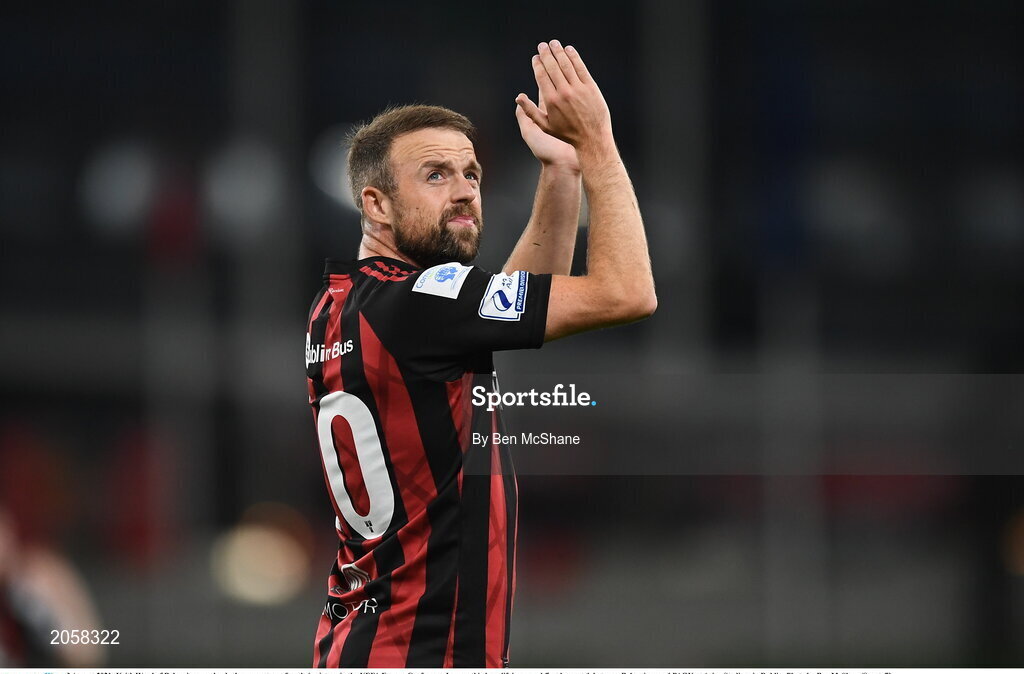3 August 2021; Keith Ward of Bohemians applauds the supporters after their victory in the UEFA Europa Conference League third qualifying round first leg match between Bohemians and PAOK at Aviva Stadium in Dublin. Photo by Ben McShane/Sportsfile