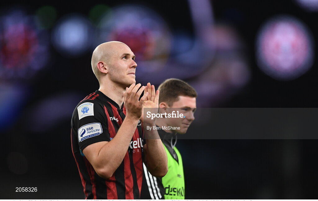 3 August 2021; Georgie Kelly of Bohemians applauds the supporters after the UEFA Europa Conference League third qualifying round first leg match between Bohemians and PAOK at Aviva Stadium in Dublin. Photo by Ben McShane/Sportsfile