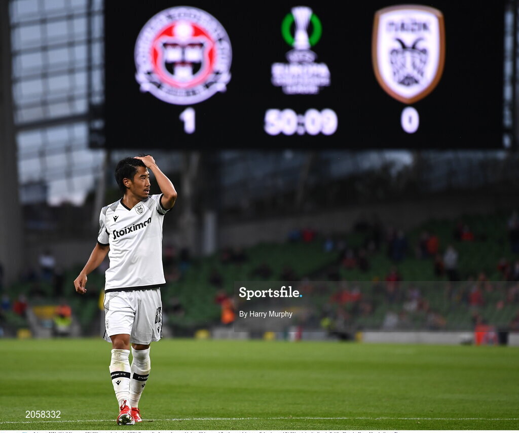 3 August 2021; Shinji Kagawa of PAOK reacts during the UEFA Europa Conference League third qualifying round first leg match between Bohemians and PAOK at Aviva Stadium in Dublin. Photo by Harry Murphy/Sportsfile