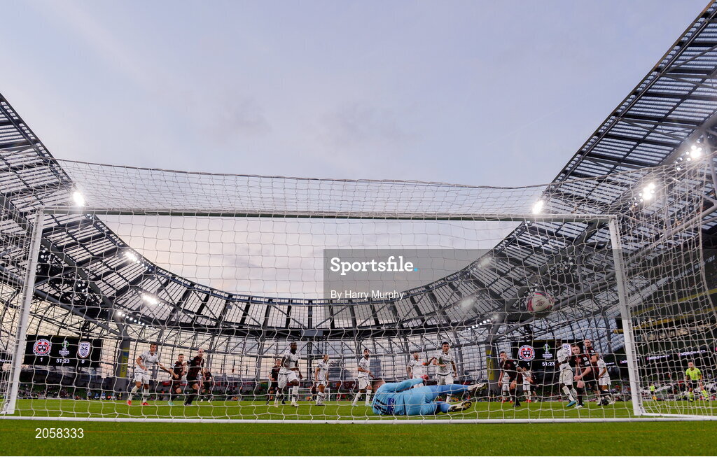 3 August 2021; Alexandros Paschalakis of PAOK fails to keep out Ali Coote of Bohemians second goal during the UEFA Europa Conference League third qualifying round first leg match between Bohemians and PAOK at Aviva Stadium in Dublin. Photo by Harry Murphy/Sportsfile