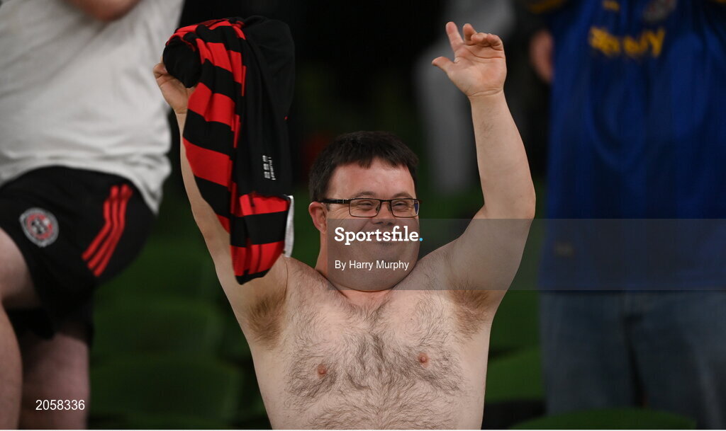 3 August 2021; A Bohemians fan celebrates after the UEFA Europa Conference League third qualifying round first leg match between Bohemians and PAOK at Aviva Stadium in Dublin. Photo by Harry Murphy/Sportsfile