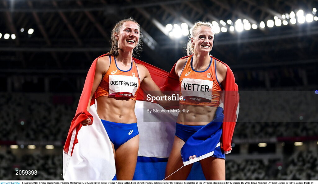 5 August 2021; Bronze medal winner Emma Oosterwegel, left, and silver medal winner Anouk Vetter, both of Netherlands, celebrate after the women's heptathlon at the Olympic Stadium on day 13 during the 2020 Tokyo Summer Olympic Games in Tokyo, Japan. Photo by Stephen McCarthy/Sportsfile
