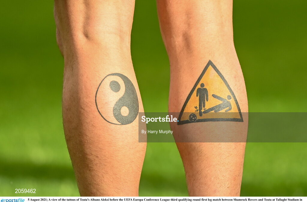 5 August 2021; A view of the tattoos of Teuta's Albano Aleksi before the UEFA Europa Conference League third qualifying round first leg match between Shamrock Rovers and Teuta at Tallaght Stadium in Dublin. Photo by Harry Murphy/Sportsfile