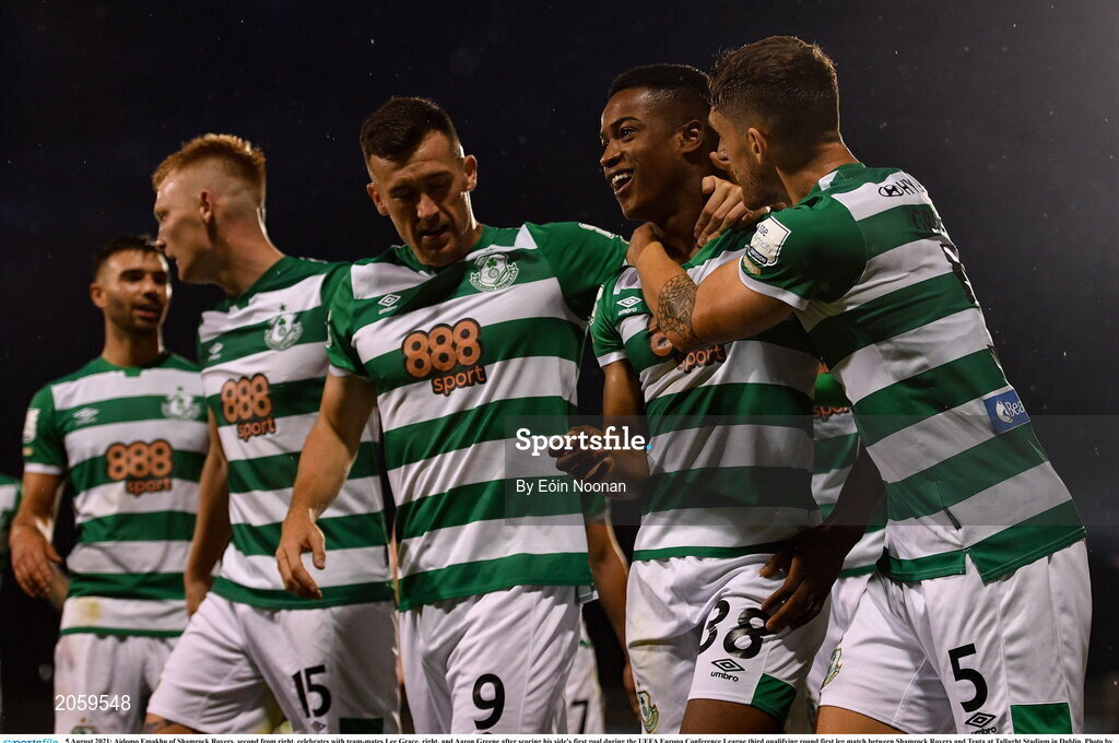 5 August 2021; Aidomo Emakhu of Shamrock Rovers, second from right, celebrates with team-mates Lee Grace, right, and Aaron Greene after scoring his side's first goal during the UEFA Europa Conference League third qualifying round first leg match between Shamrock Rovers and Teuta at Tallaght Stadium in Dublin. Photo by Eóin Noonan/Sportsfile