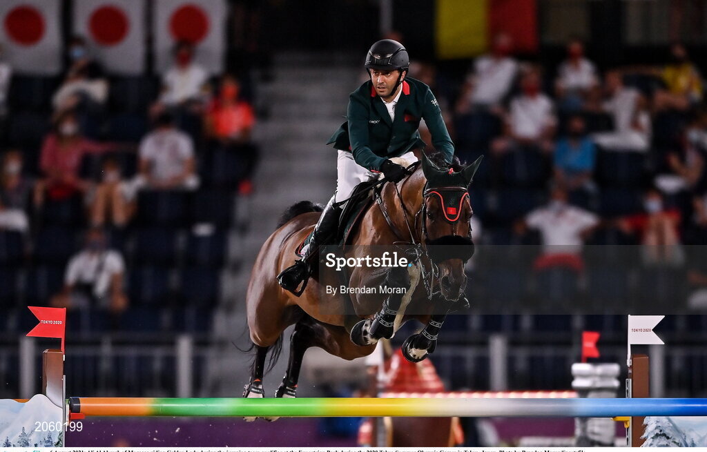 6 August 2021; Ali Al Ahrach of Morocco riding Golden Lady during the jumping team qualifier at the Equestrian Park during the 2020 Tokyo Summer Olympic Games in Tokyo, Japan. Photo by Brendan Moran/Sportsfile
