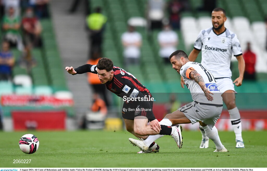 3 August 2021; Ali Coote of Bohemians and Adelino Andre Vieira De Freitas of PAOK during the UEFA Europa Conference League third qualifying round first leg match between Bohemians and PAOK at Aviva Stadium in Dublin. Photo by Ben McShane/Sportsfile