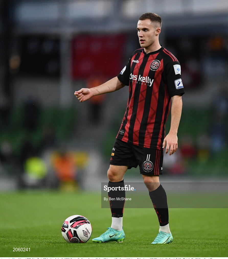 3 August 2021; Liam Burt of Bohemians during the UEFA Europa Conference League third qualifying round first leg match between Bohemians and PAOK at Aviva Stadium in Dublin. Photo by Ben McShane/Sportsfile