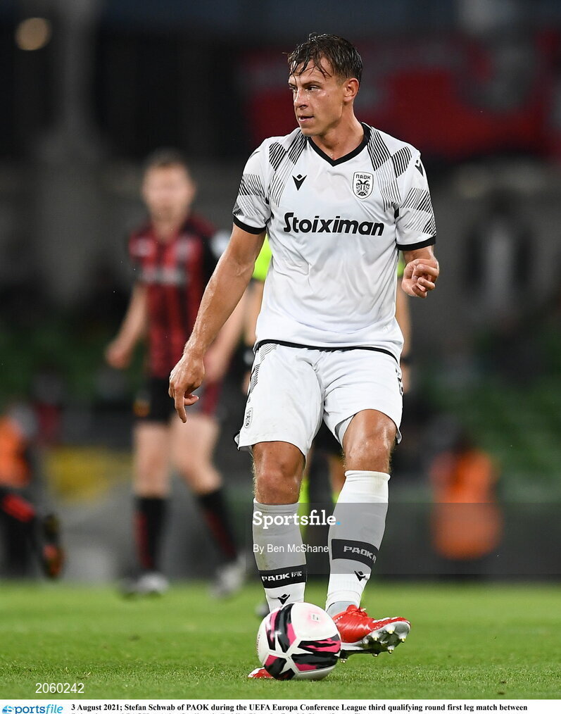 3 August 2021; Stefan Schwab of PAOK during the UEFA Europa Conference League third qualifying round first leg match between Bohemians and PAOK at Aviva Stadium in Dublin. Photo by Ben McShane/Sportsfile