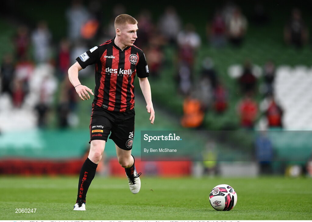 3 August 2021; Ross Tierney of Bohemians during the UEFA Europa Conference League third qualifying round first leg match between Bohemians and PAOK at Aviva Stadium in Dublin. Photo by Ben McShane/Sportsfile