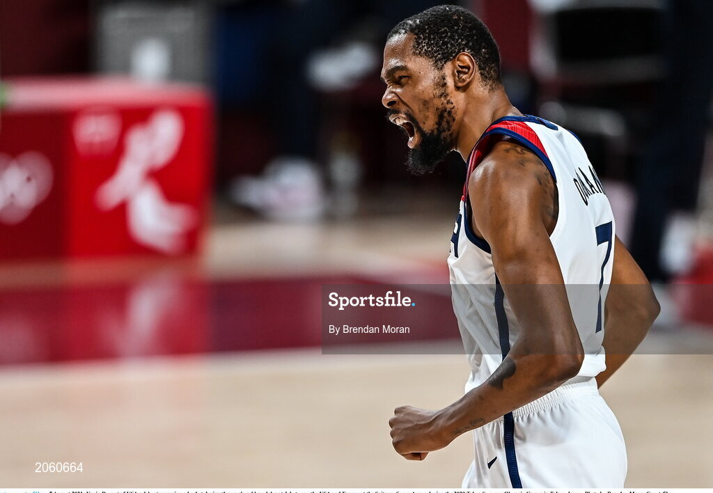 7 August 2021; Kevin Durant of USA celebrates scoring a basket during the men's gold medal match between the USA and France at the Saitama Super Arena during the 2020 Tokyo Summer Olympic Games in Tokyo, Japan. Photo by Brendan Moran/Sportsfile