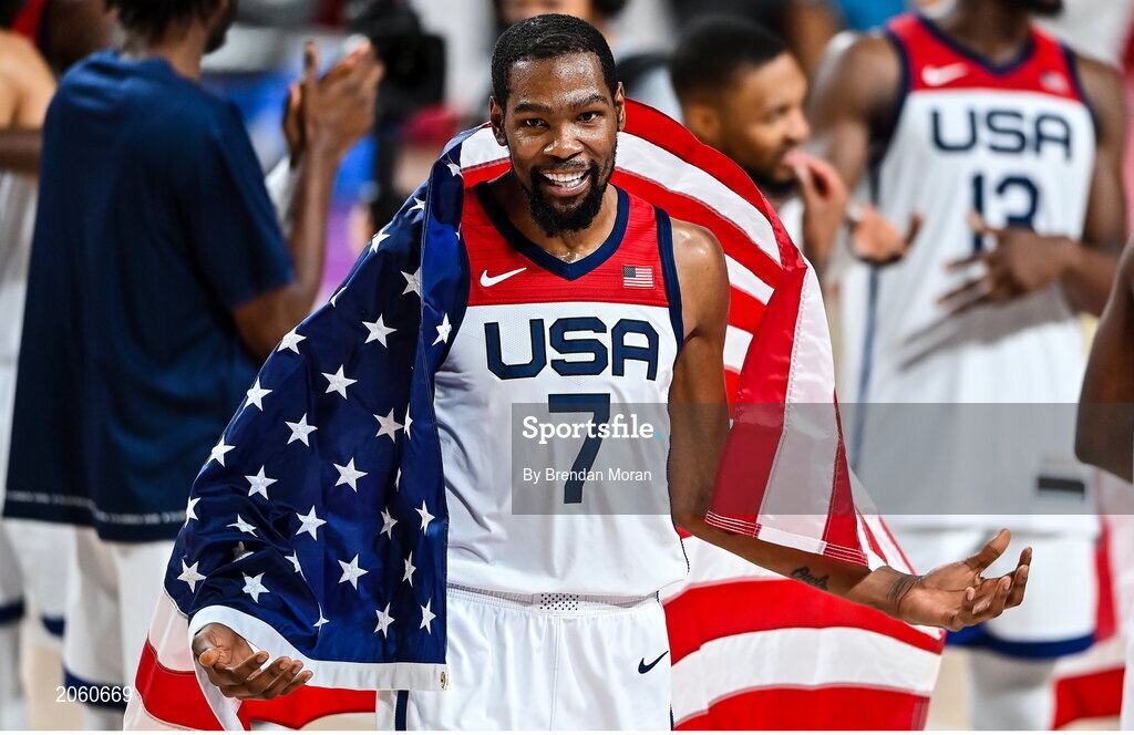 7 August 2021; Kevin Durant of USA celebrates after the men's gold medal match between the USA and France at the Saitama Super Arena during the 2020 Tokyo Summer Olympic Games in Tokyo, Japan. Photo by Brendan Moran/Sportsfile