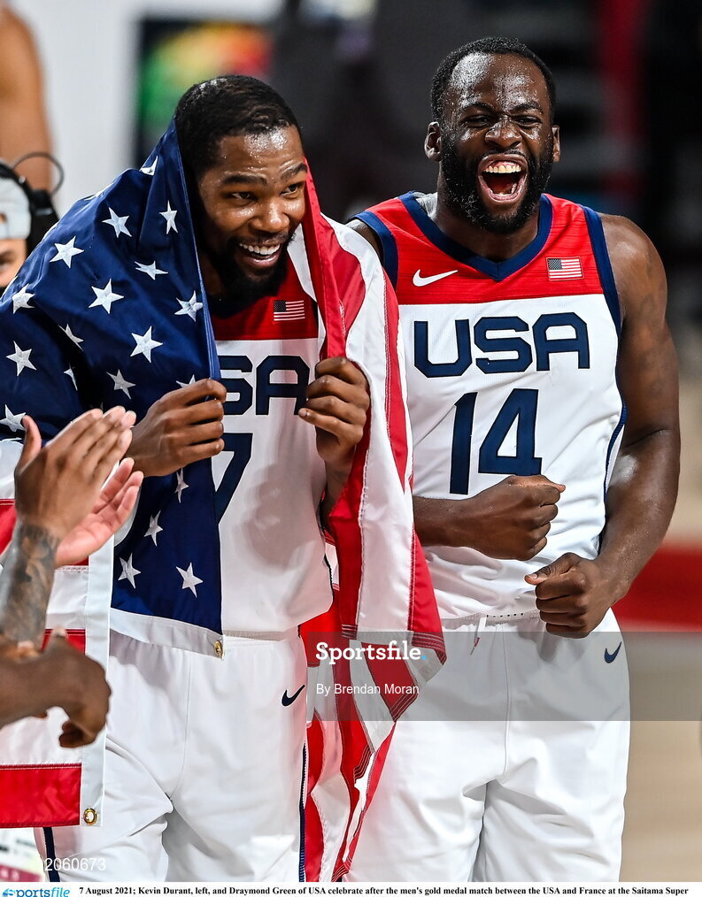 7 August 2021; Kevin Durant, left, and Draymond Green of USA celebrate after the men's gold medal match between the USA and France at the Saitama Super Arena during the 2020 Tokyo Summer Olympic Games in Tokyo, Japan. Photo by Brendan Moran/Sportsfile