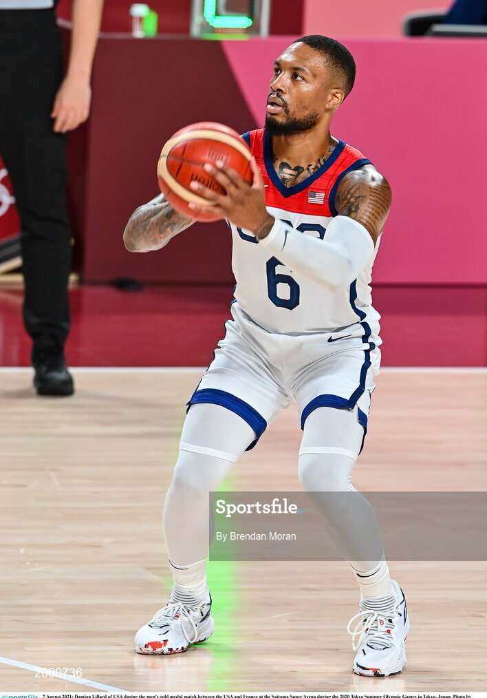 7 August 2021; Damian Lillard of USA during the men's gold medal match between the USA and France at the Saitama Super Arena during the 2020 Tokyo Summer Olympic Games in Tokyo, Japan. Photo by Brendan Moran/Sportsfile