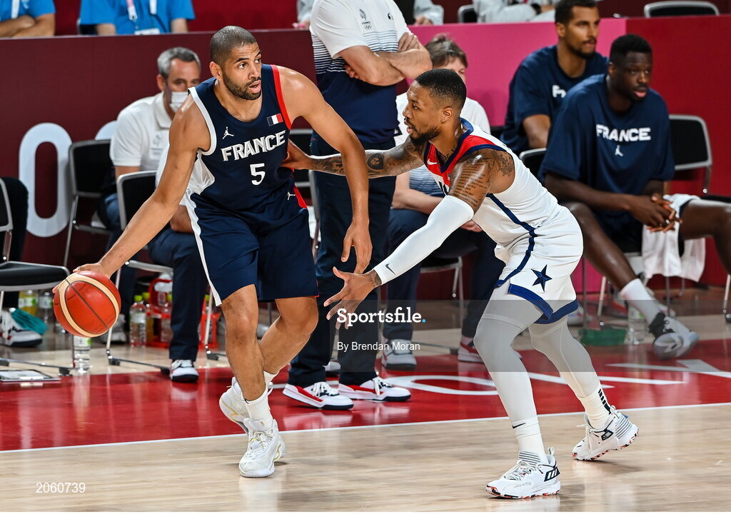 7 August 2021; Nicolas Batum of France in action against Damian Lillard of USA during the men's gold medal match between the USA and France at the Saitama Super Arena during the 2020 Tokyo Summer Olympic Games in Tokyo, Japan. Photo by Brendan Moran/Sportsfile