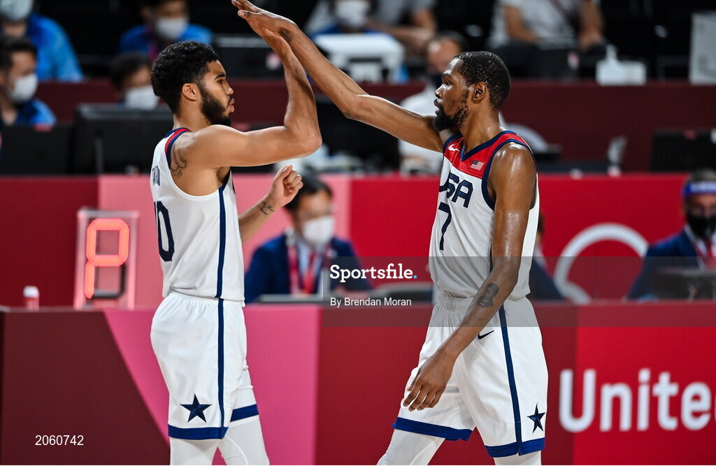 7 August 2021; Jayson Tatum, left, and Kevin Durant of USA during the men's gold medal match between the USA and France at the Saitama Super Arena during the 2020 Tokyo Summer Olympic Games in Tokyo, Japan. Photo by Brendan Moran/Sportsfile