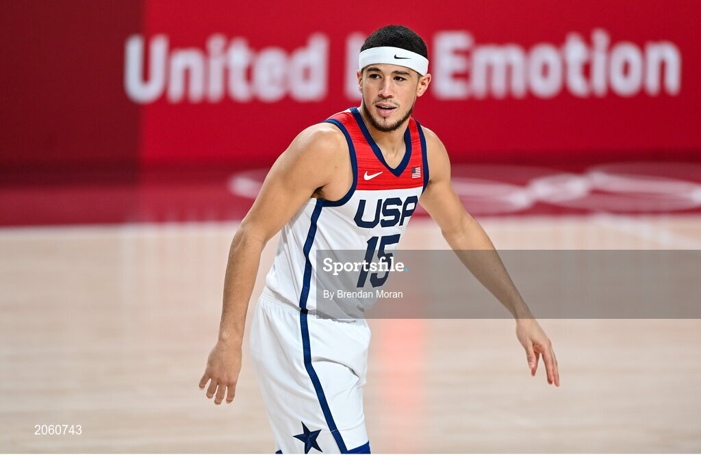 7 August 2021; Devin Booker of USA during the men's gold medal match between the USA and France at the Saitama Super Arena during the 2020 Tokyo Summer Olympic Games in Tokyo, Japan. Photo by Brendan Moran/Sportsfile