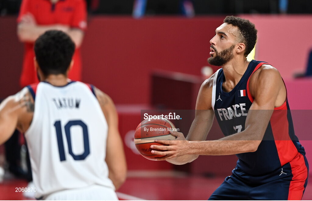 7 August 2021; Rudy Gobert of France during the men's gold medal match between the USA and France at the Saitama Super Arena during the 2020 Tokyo Summer Olympic Games in Tokyo, Japan. Photo by Brendan Moran/Sportsfile