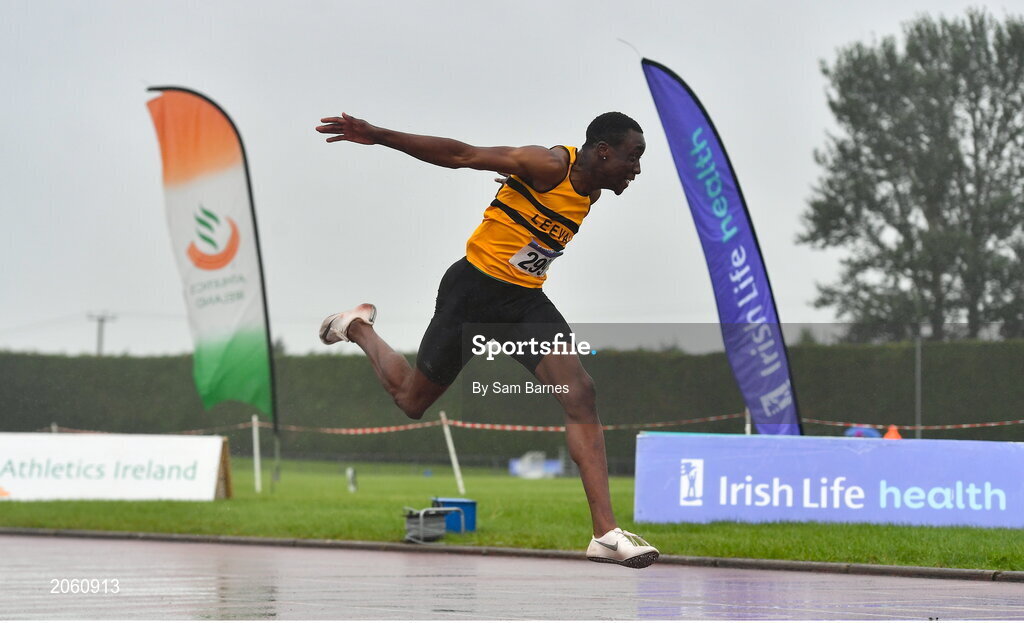 7 August 2021; James Ezeonu of Leevale AC, Cork, crosses the line to win the Boy's U19 200m during day two of the Irish Life Health National Juvenile Track & Field Championships at Tullamore Harriers Stadium in Tullamore, Offaly. Photo by Sam Barnes/Sportsfile