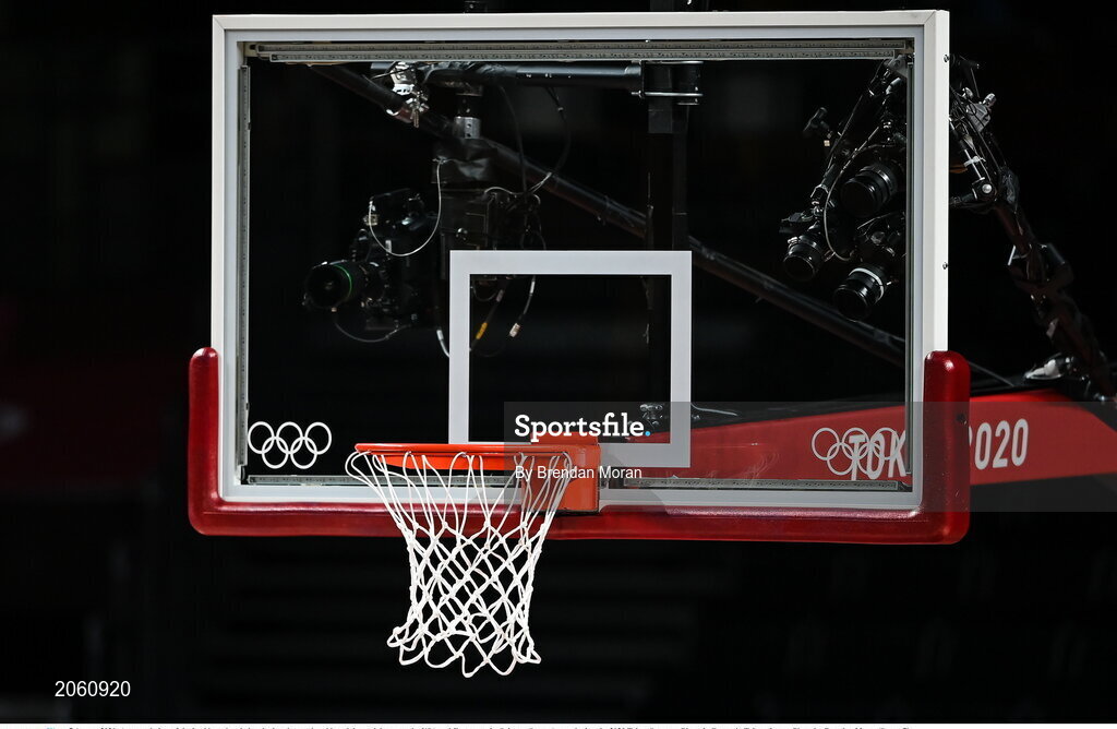 7 August 2021; A general view of the backboard and ring during the men's gold medal match between the USA and France at the Saitama Super Arena during the 2020 Tokyo Summer Olympic Games in Tokyo, Japan. Photo by Brendan Moran/Sportsfile